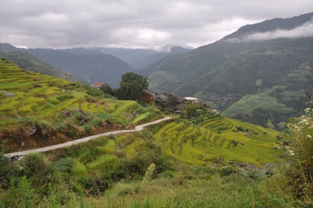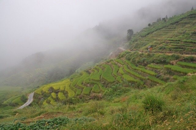 At 9:30 we headed out for Longsheng Rice Terraces. It was a 2-hour drive up into the mountains where we saw beautiful scenery. When we reached the top of the main road, we transferred to a van that took us on a 20-minute drive to the end of the road. China Focus had arranged for us to visit a small village that is not usually visited by tourists, so we walked up the mountain to the village above the rice paddies. The weather was misty and somewhat foggy. It was a pleasant walk, though.