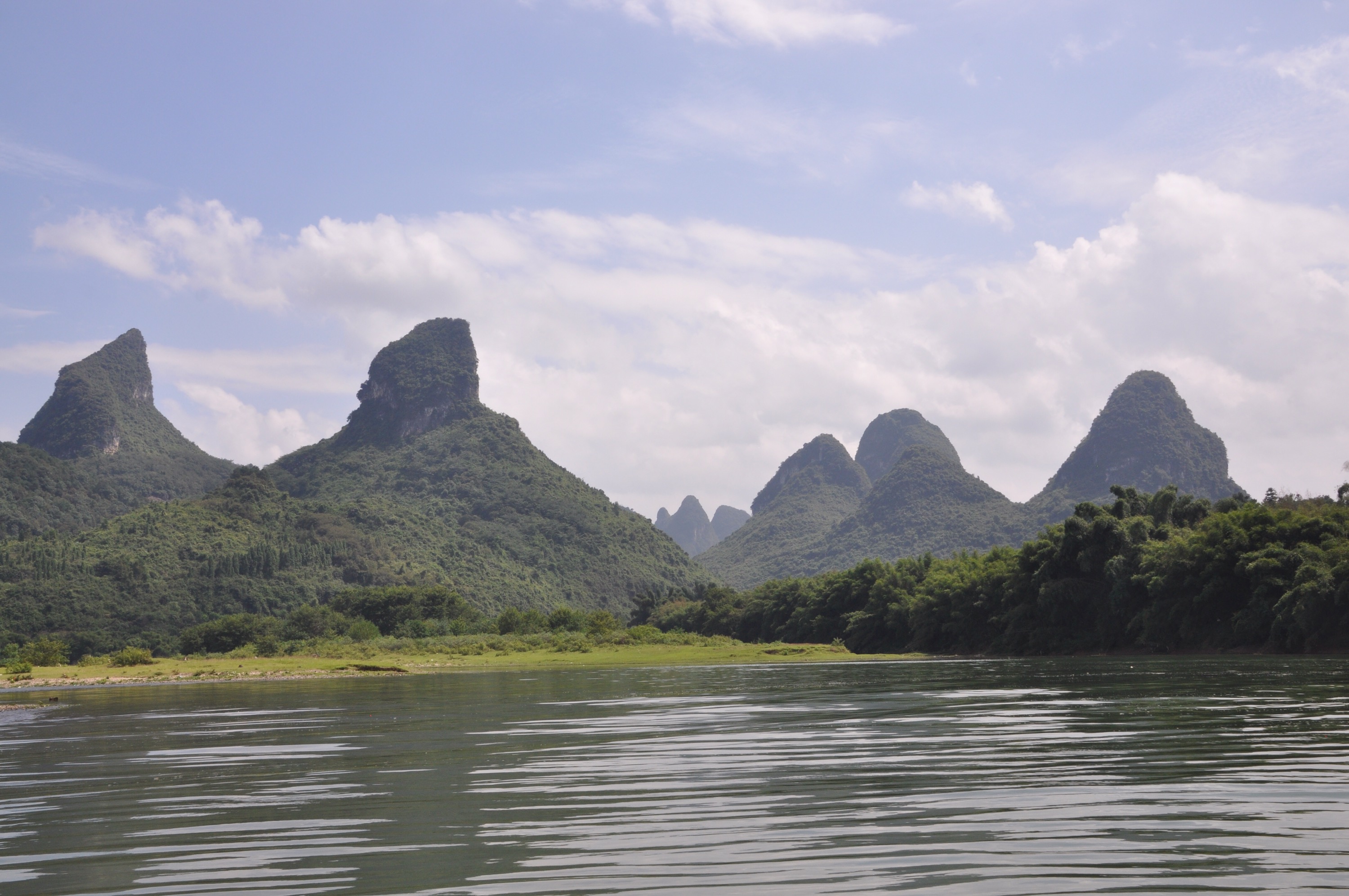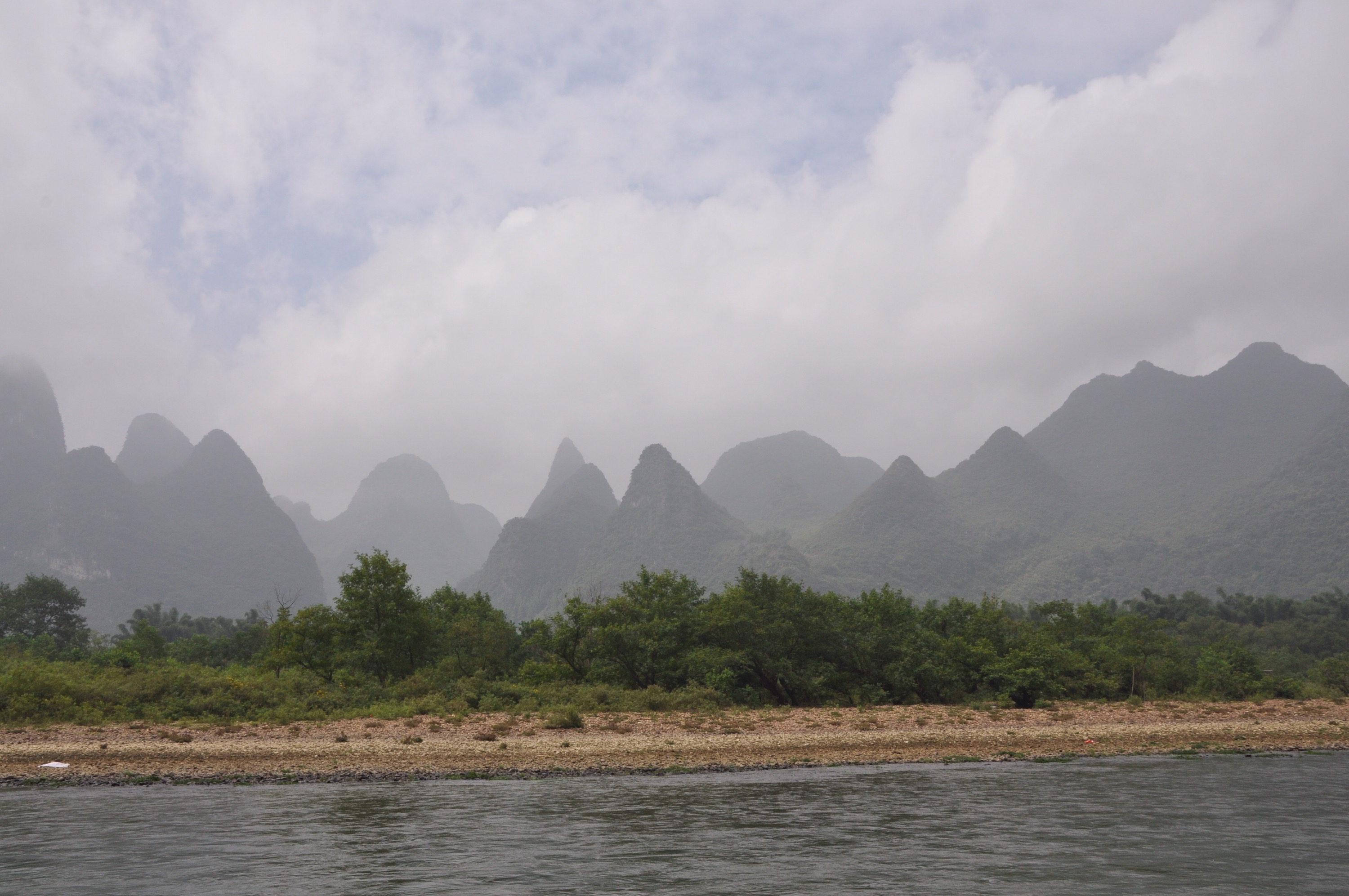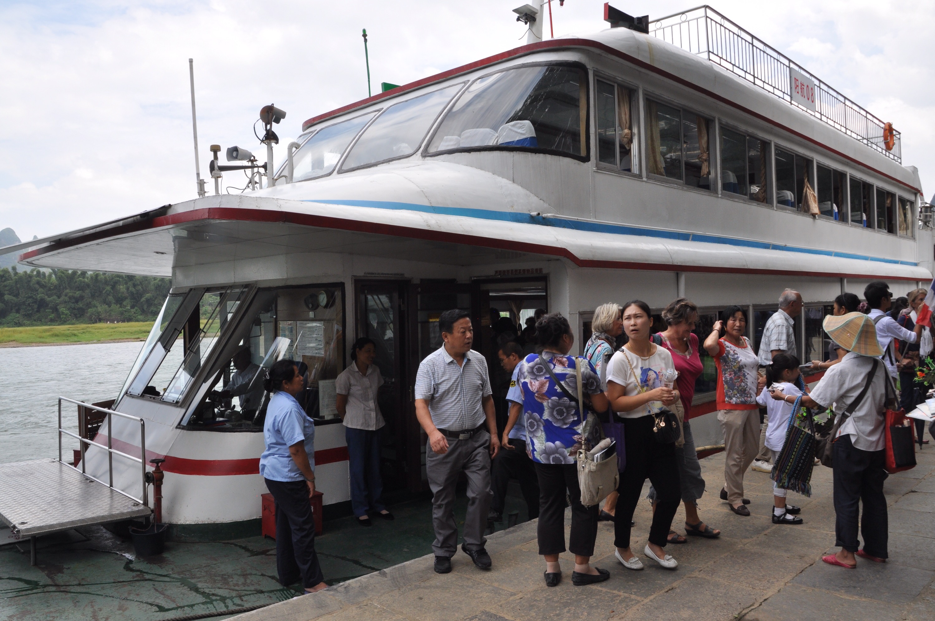 After checking out of our hotel, our bus took us to the dock for the Li River Cruise. Everyone on the ship had been assigned seats, and our guide said mine was at a window. We opened this large window, and I took most of my pictures from my seat. Once I walked up to the viewing deck at the top of the ship, but our window view was much better. During the cruise, we had a mediocre Chinese buffet lunch, but that was no surprise because our guide had warned us to eat a big breakfast.