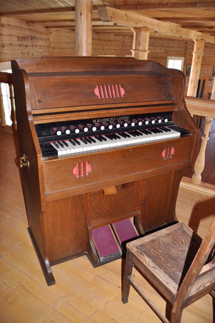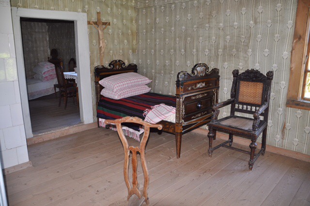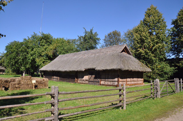 Our first bus stop was the Rumsiskes Open-Air Museum. The wooden buildings were brought here from other locations in Lithuania. The windmills are moveable when the wind direction changes. We passed some Lowland Horses which were strong war horses. We entered a house that would have belonged to a family just above middle class. We then drove to the next group of houses which were upper class. The richer people could afford carved dining chairs and a separate building for baking bread. Next we got to spend a little time in an example of a village. Linda and I walked through the school house then the church. When we were trying to see the harmonia (which looks like a small organ) from the main floor, a woman who works there invited us upstairs to the roped off balcony.) That was very nice of her to do that.