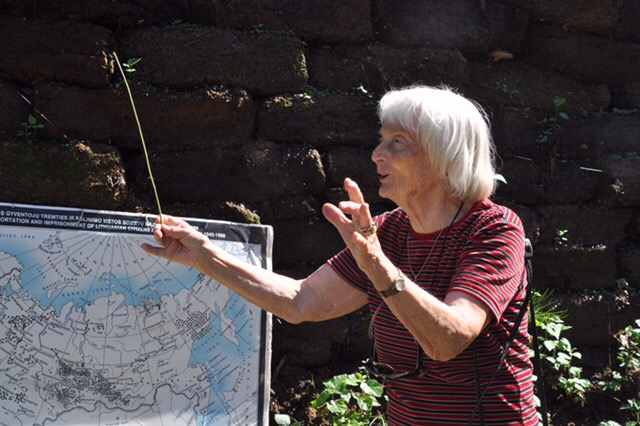 We then drive to a wooded area where we met 86-year-old Irena Spakaliskiene who was the inspiration for the book, BETWEEN SHADES OF GREY. When she was a child, her family was sent to Siberia. She survived all the hardship there. In 1947 she was sent to Lithuania to study fishing techniques. When she arrived, they had lost her registration, so she couldn’t study. Anyone who had been a prisoner in Siberia was looked down upon, so she burned her papers. She worked 12-hour days and still she could not afford bread, so she ate dog food.