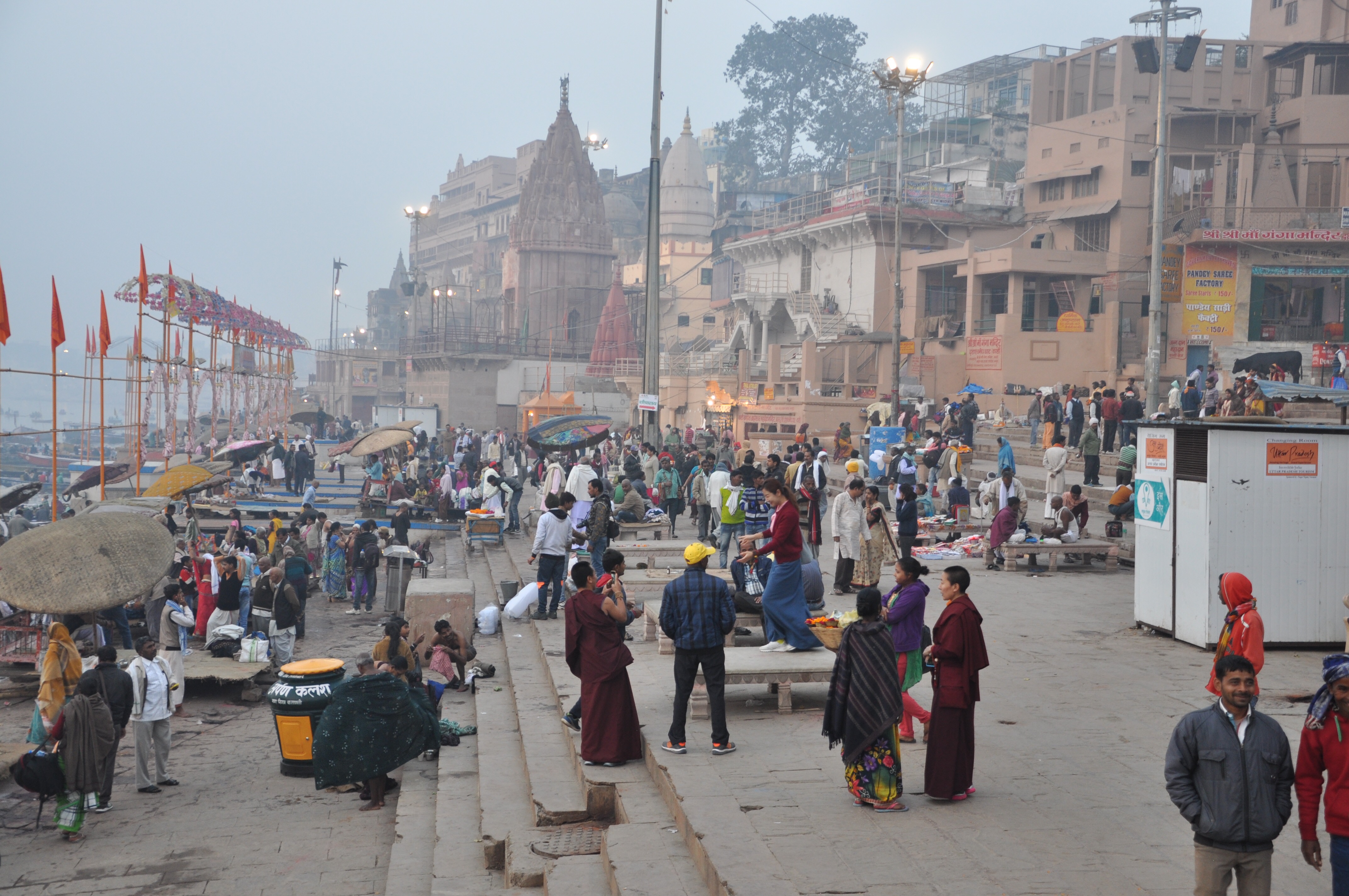 Our city guide told us a lot about the various religions of the people here and their cremation tradition. We watched the sunrise over the river and watched the funeral pyres in one location. Elsewhere, people were throwing ashes in the river. Along this river bank in one of the houses, the Beatles stayed for a while and wrote, “Here Comes the Sun.” Other movie stars stayed in this area too. We disembarked the boat and walked along the bank among the colorfully dressed people, cows, and even a snake charmer. We then rode the bus back to the hotel to eat breakfast.