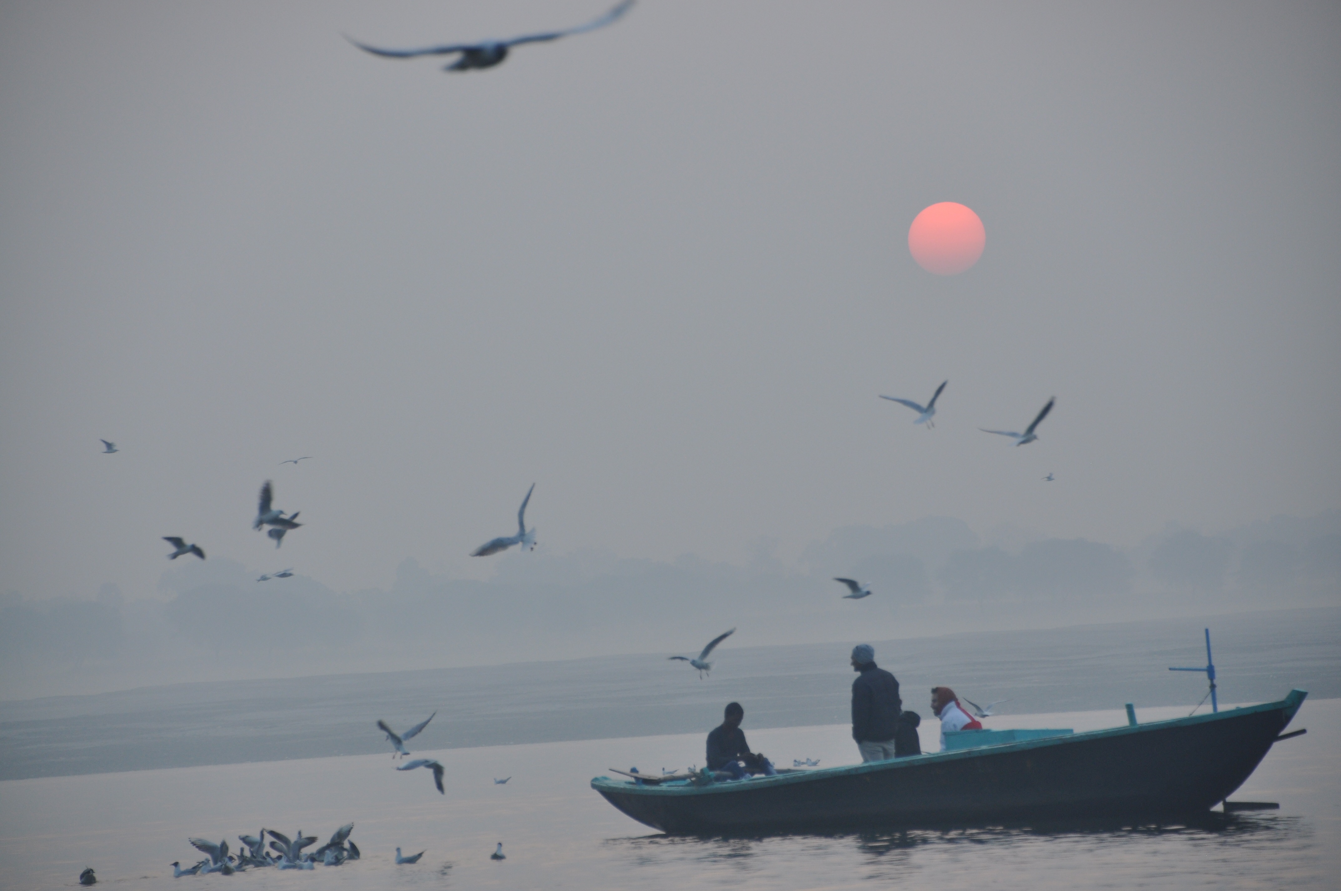 This morning we left the hotel at 6:00 to ride the bus to the Ganges. It was still dark outside, but the narrow streets were well-lit when we got out to walk to the riverbank. We saw lines of people walking who were carrying ashes. When we got to the river, we stepped down steep concrete stairs to get to our large rowboat. I am glad I followed Ranvir’s suggestion to being my trekking poles.